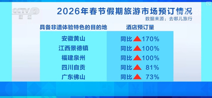 数据显示,寒假和春节期间,具备非遗体验特色的目的地酒店预订量增长明显。安徽黄山酒店预订量同比增长1.7倍,江西景德镇、福建泉州酒店预订量同比翻番。