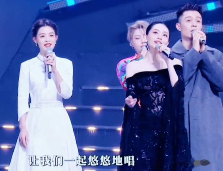 全靠多年主持素养硬撑,给孙悦这个乐坛前辈先让出了C位,然后自己因为没有位置,站在第二排。想也知道,换成谁当导演,都不会把个子偏矮的王祖蓝放在后排。
