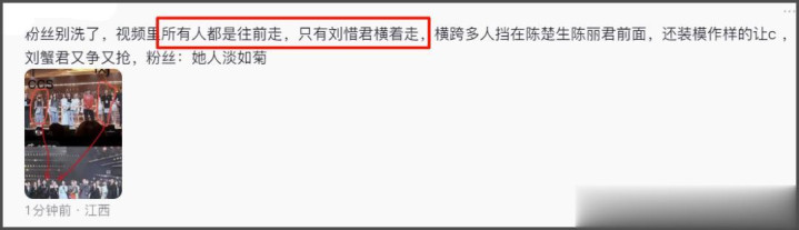 本来晚会的站位就是按照资历和流量排的,当然是大前辈和流量大的站中间吸引观众,结果被别的艺人横插一脚,抢走C位,观众看了也不会舒服。事件迅速升级,刘惜君评论区也沦陷了,不少网友都吐槽她是“螃蟹姐”,走位横着走也是少见。