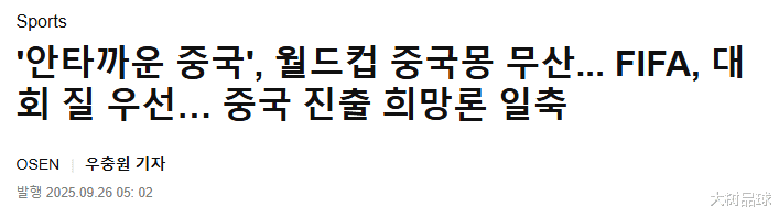 韩国媒体“OSEN”这么嘲讽道:“从2002世界杯以后,中国男足就一直没有晋级世界杯决赛圈。即使2026世界杯扩军了,亚洲名额多达8.5个,可中国男足仍然没有晋级。如果世界杯参赛队达到了64队,那么亚洲名额会多达12.5个,中国男足进世界杯的希望会更大。可是这次世界杯扩军64队计划失败,中国男足的世界杯梦也会破碎。”能够看出来,韩媒是一有机会就讽刺中国足球。