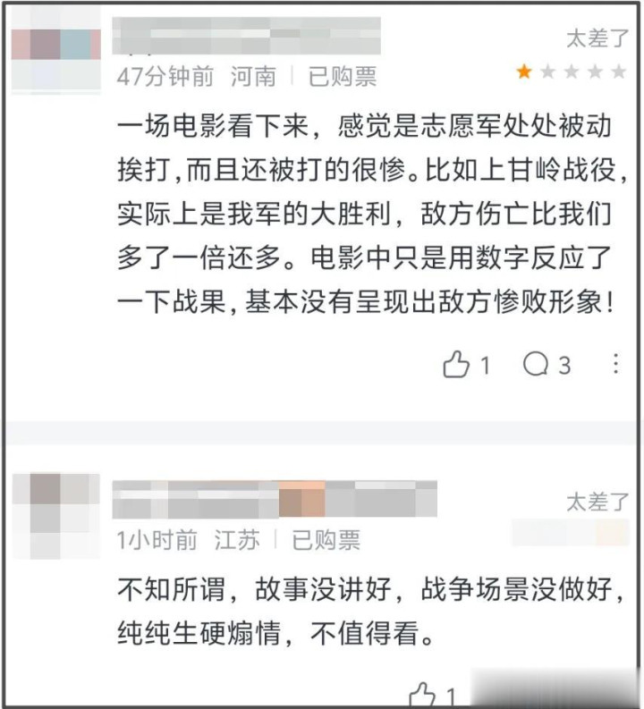 老式主旋律片又来了,甚至连槽点都没变化,《志愿军》上到第三部了,上映两天票房破亿艰难,有观众反馈最期待的上甘岭战役都没拍好,不应该啊!