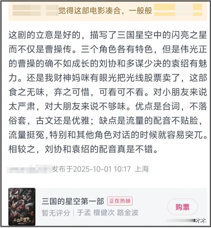 对于三国爱好者来说,平平无奇没太大意思,对动画电影重要受众小朋友来说,又有点复杂有点严肃,某种程度上,挺像粉丝电影,可能更适合对易中天和三国有情怀的观众。