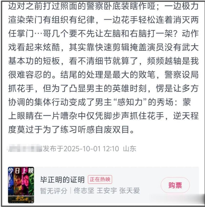 王安宇饰演的男主毕正明都放在电影标题了,他演了一个意外致残的警察,为了证明自己闯入了盗贼团伙,故事主题是反扒,但众所周知,一部凸显主角还带有个人英雄主义色彩的片子,演员最好还是有点票房号召力,不然很容易自娱自乐。