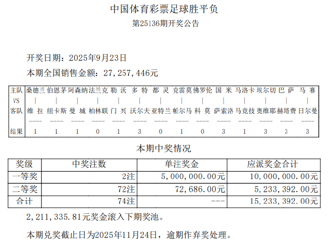 北京时间9月23日,胜负彩第25136期开奖结果揭晓。本期足彩头奖仅开出2注,单注奖金500万元,221万余元滚存至下期奖池;二等奖开出72注72,686元;任九开1031注14,252元。本期足彩销量为27,257,446元,任九投注总额为22,960,506元。
