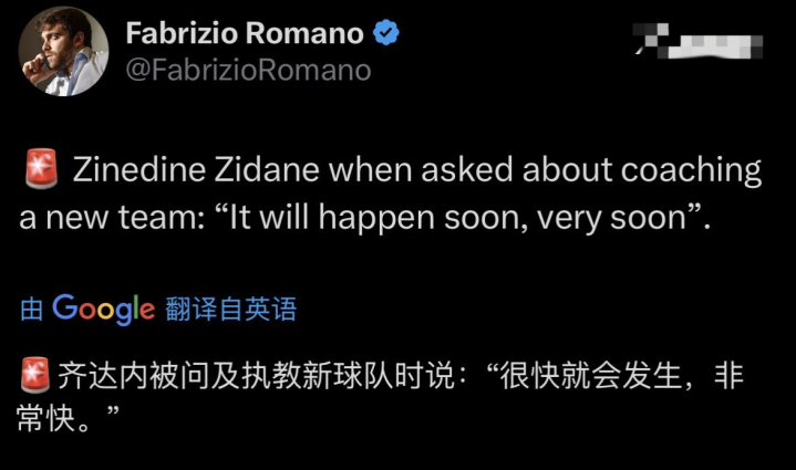 2025年11月11日,据知名记者罗马诺最新消息,法国男足世界级球星、前法国队中场齐达内亲口表示,很快就会执教新的球队了。据了解,最近齐达内来到了土伦,参加了1场传奇球员比赛,期间有人问他什么时候会再次执教,齐达内亲口回答:“很快(指几天后就有消息)。”从各方面的消息来看,这次齐达内将执教的球队不大可能是法国国家队,而应该是意甲球队亚特兰大。